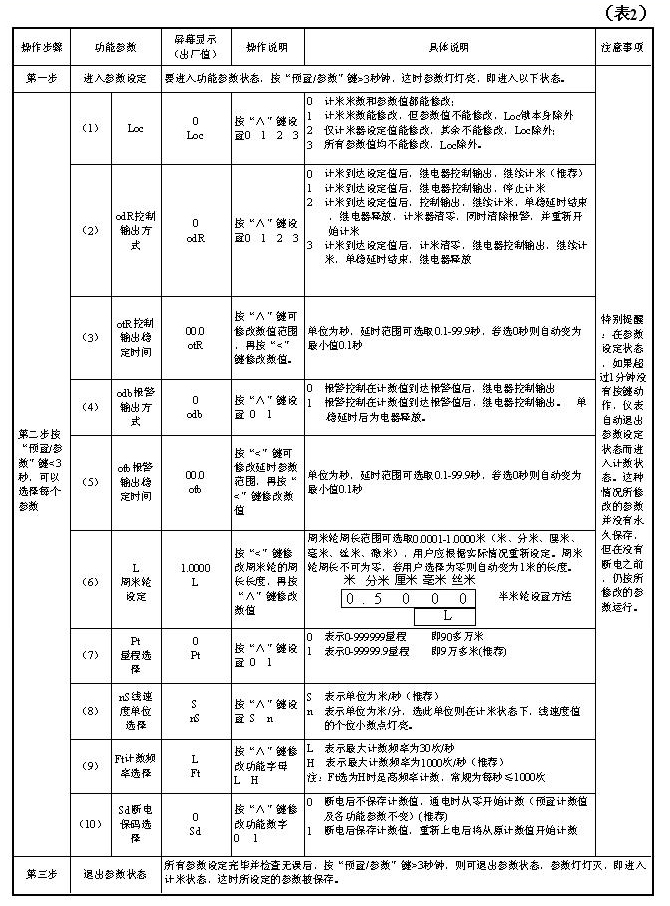 按“预置/参数”键3秒钟,则可进入功能参数设定状态,参数灯亮,再按“预置/参数”键可选择要修改的功能。具体参数见(表2)